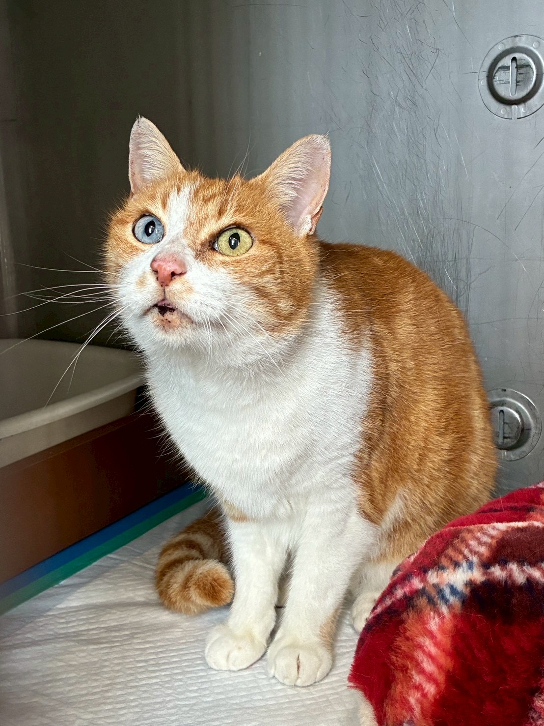 掲載日:2026年1月16日 譲渡動物動物 :25-55 整理番号: 25-55 分類: 猫(譲渡) 種類: MIX、茶白 性別: オス 特徴: 15歳。不妊手術済。 人馴れしています。 体格のよい子です。左右の瞳の色が違うのが特長です。 寄り添って頂ける飼い主さんを募集します。